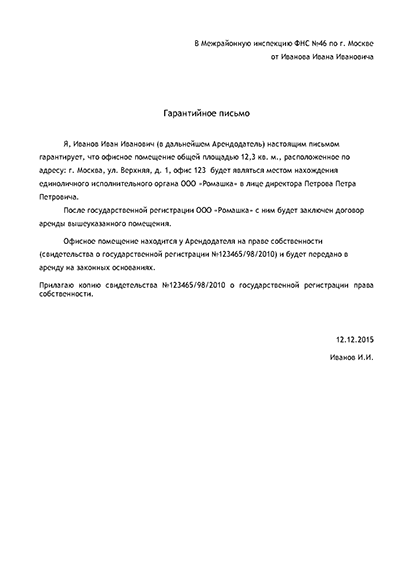 Арендодатель готовит письмо собственноручно, отражая в нем свое согласие на сотрудничество с конкретным ООО. Предоставить гарантию может и юридическое лицо, и физическое — для налоговой не имеет значения, кто является собственником объекта.